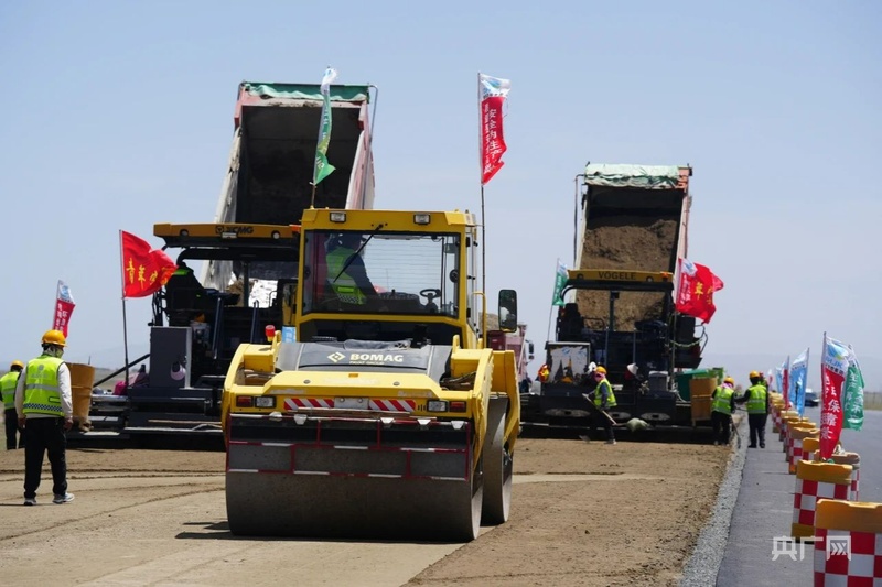 沥青摊铺机作业、压路机有序跟进、运料车往来穿梭……在倒湖茶公路二郎剑至黑马河段建设工地,500多名施工人员加班加点、全力以赴推进项目建设。